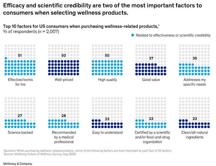 The paradox comes when we consider that even though surveys say consumers seek doctor recommendations and quote clinical efficacy as a top purchasing criteria… it can be very hard for consumers to parse out what credibility looks like when it comes time to add to cart. The Wild West of non-FDA regulated supplements and viral social media trends have made it easier than ever for anyone (even with no credentials) to sell women a dream and some snake oil — all in the name of wellness.